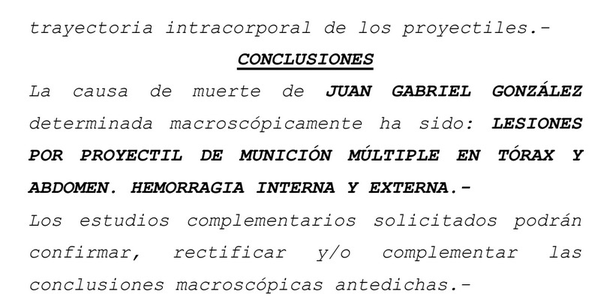 Las causas de la muerte de González fueron “lesiones provocadas por proyectil de munición múltiple en el tórax y abdomen, con hemorragia interna y externa”, según indica el documento oficial de la autopsia.