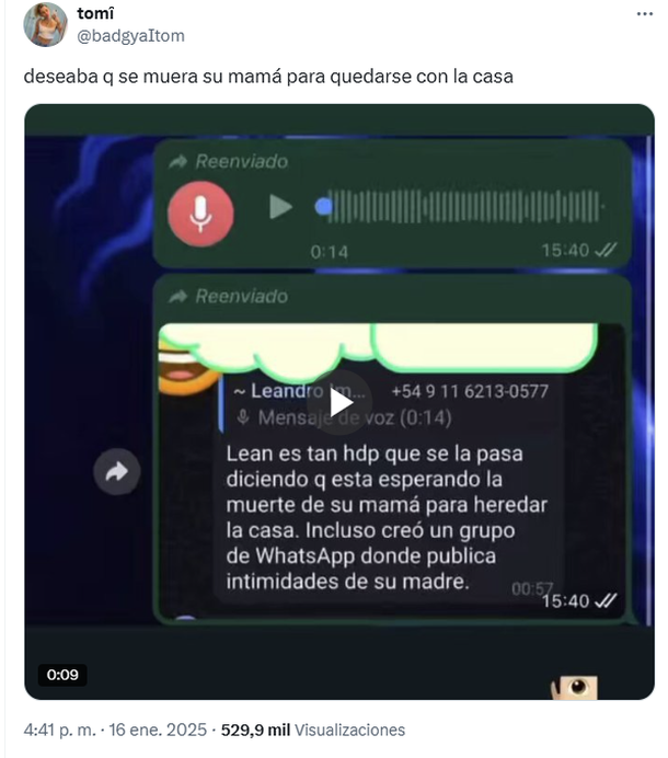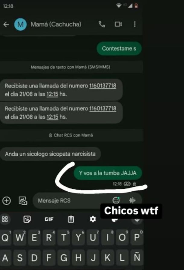 “Andá a un psicólogo, narcisista”, le dijo su mamá en otra de las conversaciones que se viralizaron en redes sociales. A eso, Leandro le respondió: “Y vos a la tumba jaja”.