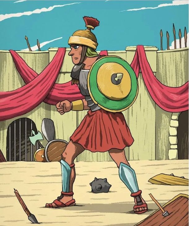 La siguiente imagen presentada por Genial Guru muestra la escena de un coliseo. Al gladiador que aparece en la imagen le hace falta un objeto de vital importancia: su espada.
