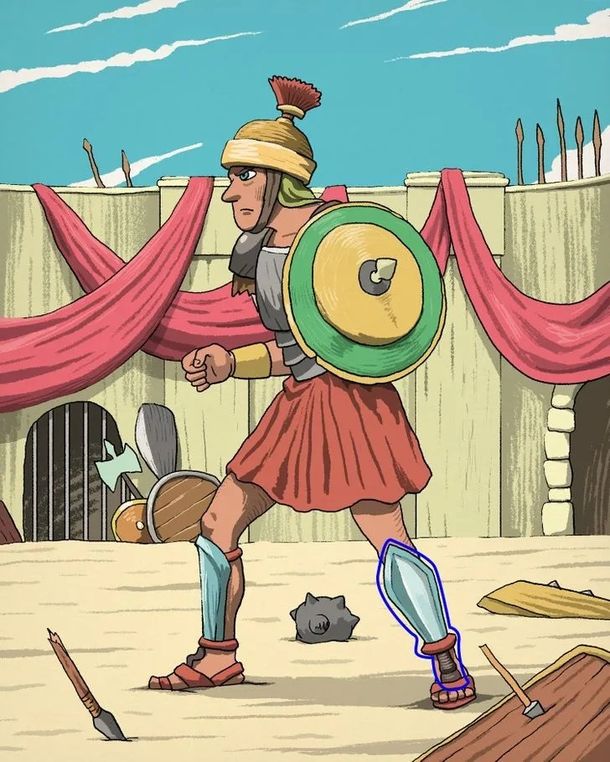 SI lograste encontrar la espada sos un maestro de la observación. Si no fuiste capaz de hallarla, no te desesperes, te ayudaremos con una pista: enfocá tu búsqueda en los pies del gladiador.