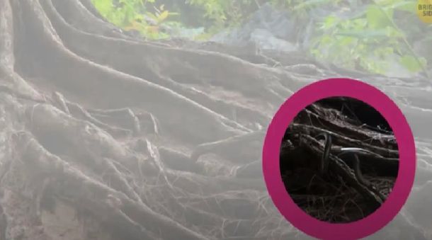 A primera vista, la foto parece representar un gran árbol en la selva. Sin embargo, la cámara se acerca para revelar que hay una serpiente marrón indescriptible inmaculadamente camuflada contra las raíces de los árboles en la esquina inferior derecha.