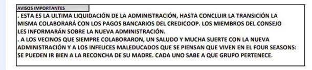 "A los vecinos que siempre colaboraron, un saludo y mucha suerte con la nueva administración. Y a los infelices maleducados que se piensan que viven en el Four Seasons: se pueden ir bien a la reconcha de su madre. Cada uno sabe a qué grupo pertenece", dice el "aviso importante" de este administrador, que llegó a X para volverse furor.
