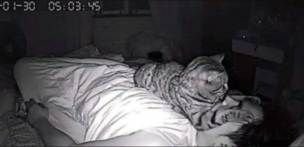 El usuario Lomphonten Lomphontan comenzó a tener dificultades al dormir, se despertaba con dolores en el cuerpo y tenía sensaciones de asfixia. Al revisar las imágenes que proyectaba la cámara de seguridad instalada en su departamento, notó que su mascota lo abrazaba tan fuerte que lo “asfixiaba”.