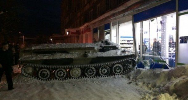 El insólito hecho ocurrió este miércoles en la ciudad rusa de Apatity, donde un hombre de 29 años fue arrestado luego de robar un vehículo militar que encontró estacionado en el predio de una autoescuela de la Fuerza Aérea y Marina, el cual luego estrelló contra las vitrinas de un supermercado solo para llevarse una bebida alcohólica.