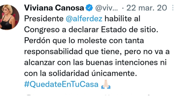 Pero por más que Viviana borre los tuits, hay uno que se hizo viral aunque Canosa lo haya eliminado: aunque usted no lo crea la chimentera le reclamaba al Presidente de la Nación que implante el estado de sitio.