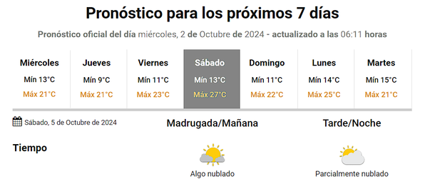 El sábado será el día más caluroso de la semana, con temperaturas que oscilarán entre los 13 y 27 grados, bajo un cielo algo nublado por la mañana y parcialmente nublado por la tarde y noche.