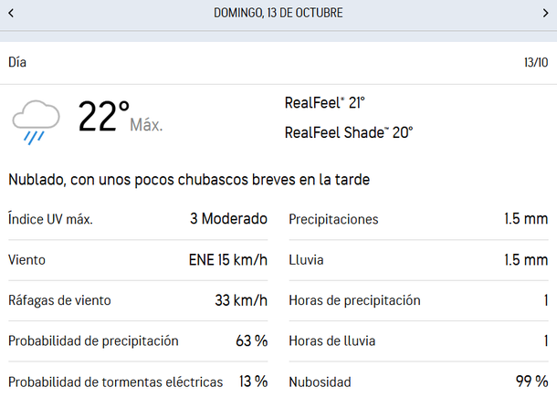 Finalmente, las lluvias se extenderán hacia el domingo, con una mayor probabilidad: 63%. A pesar de este porcentaje, AccuWeather asegura que serán unos breves chubascos a la tarde, para luego despejar.