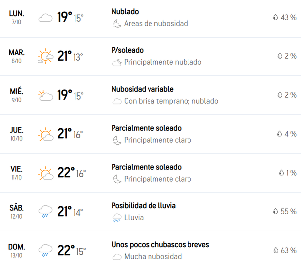Durante este fin de semana, el tiempo estará inmejorable: cielo parcialmente nublado, máxima de hasta 25 grados y sin posibilidades de precipitaciones. Algo similar ocurrirá el lunes que, aunque con un cielo nublado, presentará temperaturas agradables que irán desde los 16 hasta los 22 grados.