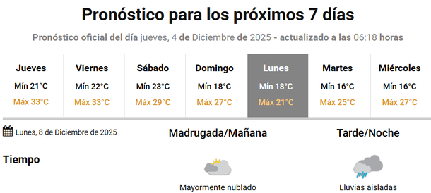 Para este lunes 8 de diciembre, luego de días con máximas de más de 30 grados, se esperan marcas térmicas que se ubicarán entre 18 y 21 grados, dando un alivio, que solo durará horas porque al día siguiente ya vuelve el calor.