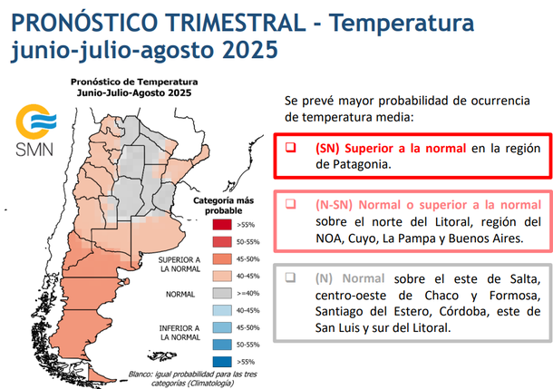 El informe trimestral del Servicio Meteorológico Nacional para junio, julio y agosto anuncia más jornadas de lluvias que las habituales en Capital Federal y sus alrededores, como también en en el este de Salta, centro-oeste de Formosa y Chaco, Santiago del Estero, oeste de Santa Fe, Córdoba, este de San Luis y este de Buenos Aires, al igual que en Entre Ríos.