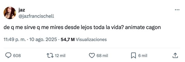 "¿De qué me sirve que me mires desde lejos toda la vida? Animate, cagón", tuiteó @jazfrancischell, posiblemente para un destinatario claro, pero que muchos interpretaron como un llamado generalizado para esos chicos que no "activan", que no se la juegan por amor.