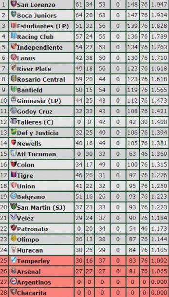 Finalmente, San Martín de Juan (1,223), Belgrano de Córdoba (1,223), Unión (1,250), Tigre (1,276) y Colón (1,315) son los otros equipos que seguramente pelearán por no meterse entre los puestos comprometidos en una lucha que, a priori, promete ser para alquilar balcones.