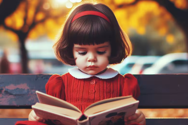 En cambio, en la segunda foto, la IA diseñó a la figura argentina como una niña de seis años. Lleva un vestido rojo y una cinta del mismo tono en su pelo. Se la ve sentada en un banco mientras lee concentrada un libro.