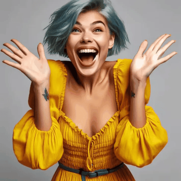 Alegría es uno de los personajes más queridos de la película. La IA la muestra como una mujer joven y agradable con un vestido amarillo y su icónico cabello azul.