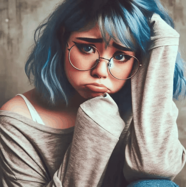 Tristeza es retratada como una mujer joven con cabello y ojos azules. Muestra una expresión de puchero con la boca y tiene el gesto compungido.