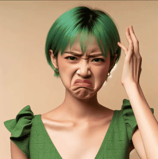 Desagrado, marcada por el color verde, es representada por la IA como una joven con pelo corto del mismo color. Se muestra con una expresión de asco fruncida, cejas arqueadas y arrugas en la nariz.