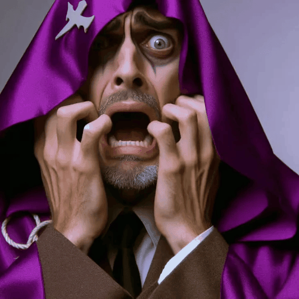 Miedo está asociado con el color violeta. Es personificado por la IA como un hombre con muchas ojeras en pánico. Tiene sus manos a la altura de la boca, abierta como para gritar, y lágrimas corriendo por sus mejillas.