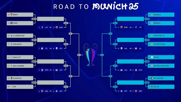 Los ganadores avanzarán a octavos de final donde ya esperan Liverpool, Barcelona, Arsenal, Inter de Milan, Atlético Madrid, Bayer Leverkusen, Lille y Aston Villa.