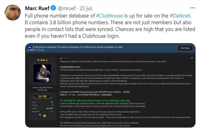 Una base de datos con 3.800 millones de números de teléfono pertenecientes a usuarios de la plataforma de chats de audio en directo, Clubhouse, se filtró en la denominada Darknet o Internet Oscura.