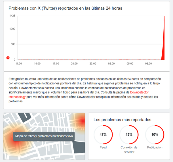 Según el mapa de fallos notificados en vivo, los inconvenientes que experimentan los usuarios impiden el uso normal de este microblog caracterizado por publicar mensajes cortos. Las quejas se dividen principalmente en tres áreas: