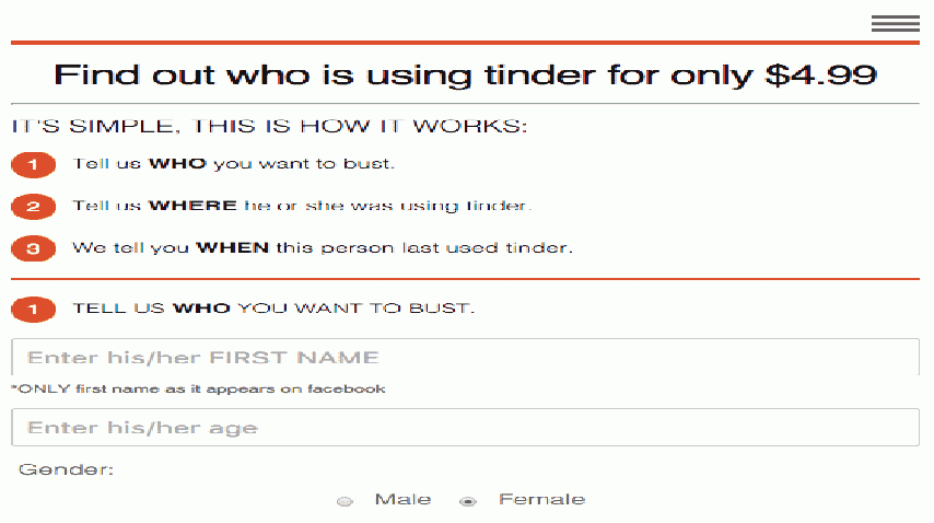 Así, lo único que la persona tiene que hacer es ingresar el primer nombre, la edad y el lugar donde cree que su pareja usó la aplicación de citas por última vez. Pero cuidado: los resultados podrían romper corazones.
