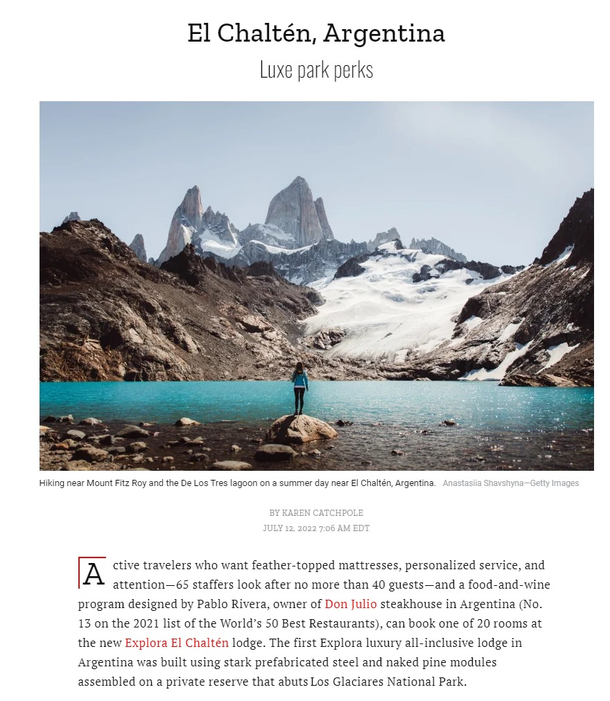 Sobre El Chaltén la revista señala: “Los viajeros activos que quieran colchones de plumas, servicio personalizado y atención y un programa de comida y vino diseñado por Pablo Rivera, pueden reservar una de las 20 habitaciones del nuevo lodge Explora El Chaltén. Se trata del primer lodge de lujo con todo incluido que se construyó a partir de descarnados módulos prefabricados de acero y pino desnudo montados en una reserva privada que linda con el Parque Nacional Los Glaciares”.