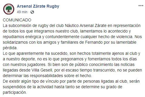 La Subcomisión de Rugby del Club Náutico Arsenal Zárate emitió este sábado un comunicado en solidaridad con los familiares de Fernando Báez Sosa, el joven de 19 años que murió en Villa Gesell como consecuencia de los golpes que recibió durante una pelea fuera del boliche “Le Brique” por parte de varios jóvenes que serían jugadores de esa entidad.
